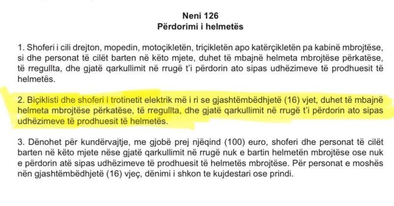 Por, Liridon Hajdini, inxhinier i Makinerisë, thotë se, sipas Nenit 126 të këtij ligji, obligimi për mbajtjen e helmetës vlen vetëm për personat nën moshën 16 vjeç.