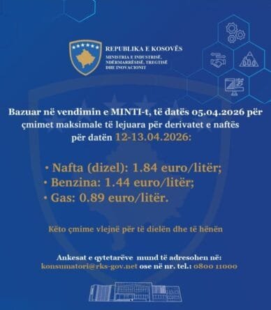 Sipas njoftimit, nafta do të shitet deri në 1.84 euro për litër, benzina deri në 1.44 euro për litër, ndërsa gasi deri në 0.89 euro për litër.