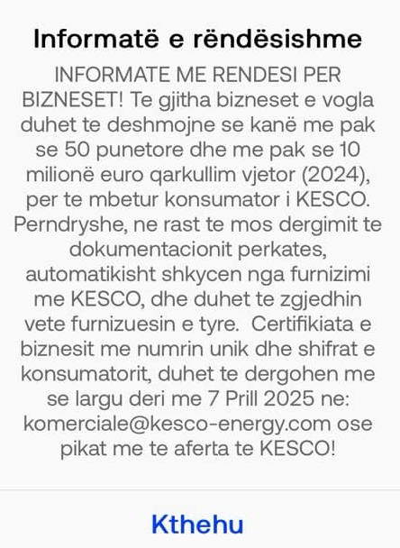 KEDS ka lëshuar një njoftim për të gjitha bizneset e vogla, që të dëshmojnë se kanë me pak se 50 punëtorë dhe që kanë qarkullim më pak se 10 milionë euro, në të kundërtën do të shkyçen nga rrjeti i energjisë elektrike dhe më pas do të detyrohen të gjejnë vet furnizues.