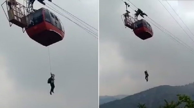 Një teleferik mbeti në ajër në malet e Indisë, ndërsa turistët nisën të zbresin me një litar, duke rrezikuar jetën në qindra metra lartësi.