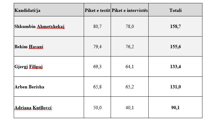 Ky është rezultati final që ka rezultuar nga testimi me shkrim dhe intervista me gojë:
