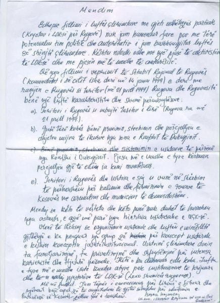 Mendoj se këto të vërteta dhe këto punë nuk duhet të harrohen nga askush , e aq më parë nga hierarkia ushtarake e UÇK-së.Vlenë te theksoj se organizimin ushtarak dhe luftën e mirëfilltë gjithnjë e ka penguar një grup që për koncept ushtarak e kishin konceptin jashtëinstitucional.Ushtrinë çlirimtare donin ta familjarizojnë,ta privatizojnë dhe shfrytëzojnë për interesa karieriste dhe thjeshtë personale.Këtë e ka dëshmuar edhe koha.Lufta e tyre më e madhe ishte kundër atyre pak institucioneve të krijuara dhe ndaj pjesëtarëve të LDK-së (lexo shumica rugovase). Më në fund .Jam tepër i emocionuar për lirinë e fituar dhe njëherit bëj apel që të angazhohemi të gjithë së bashku për ndërtimin e Pavarësisë së Kosovës-qëllim yni i tanishëm.