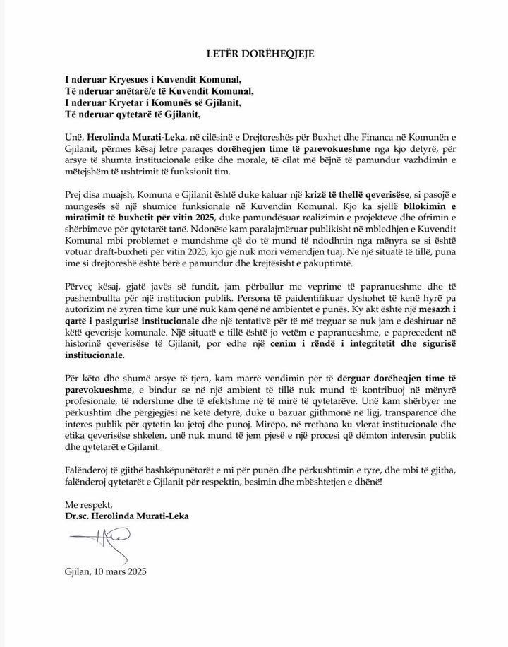 Drejtoresha për Buxhet në Gjilan, Herolinda Murati Leka, ka dhënë dorëheqje të parevokueshme nga kjo pozitë.