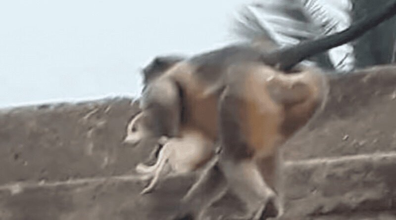 Pamjet nga mediat indiane kanë konfirmuar sulmet. Në njërën nga to, shihet një majmun që e bart një qenush në krah drejt një objekti.