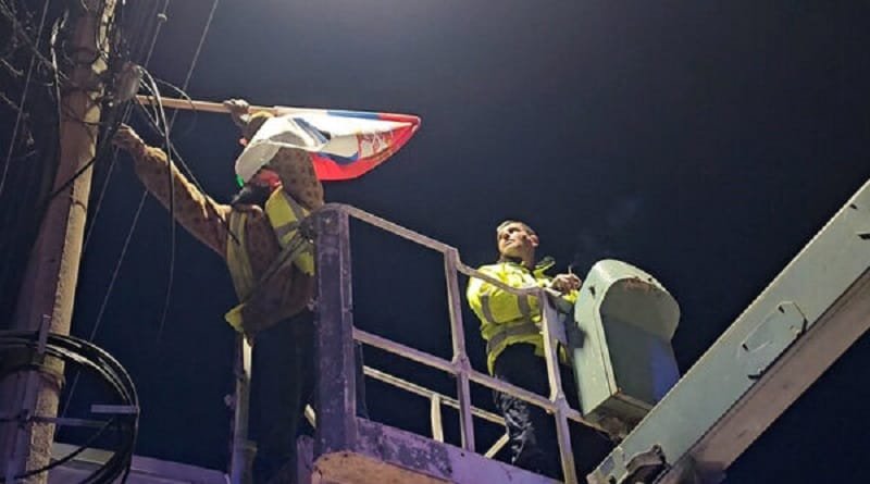 Punëtorët e një kompanie private shqiptare, të shoqëruar nga policia e Kosovës, po heqin flamujt serb që ishin vendosur përgjatë rrugës kryesore në Graçanicë këtë mëngjes.
