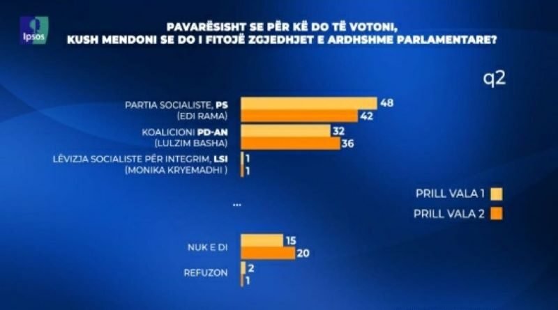 Në krahasim me valën e parë të prillit, bien shifrat e PS nga 48% që ishin dhe rriten shifrat e aleancës PD-AN nga 32% në 36%.