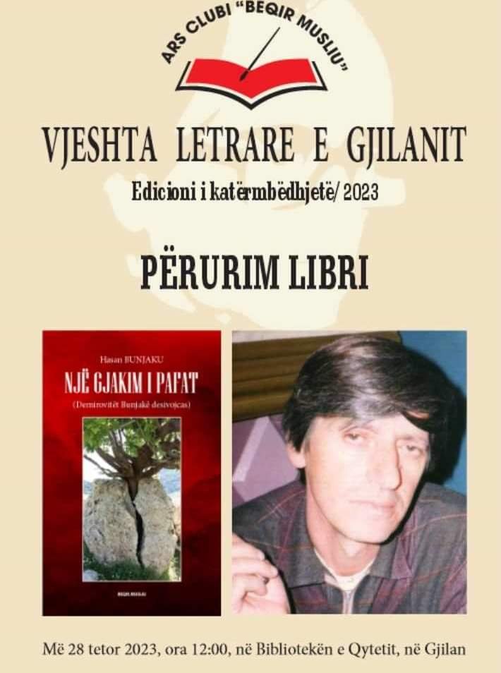 Në kuadrin e veprimtarive letrare të edicionit të 14-të të Manifestimit tashmë tradicional, “Vjeshta letrare e Gjilanit”, që organizohet nga Ars Clubi “Beqir Musliu” si dhe Biblioteka “Fan S.Noli”, kësaj të shtuneje, më 28 tetor 2023, ora 12: 00, përurohet proza dokemntare e doajenit të gazetarisë anamoravase si dhe veteranit të veprimtarive kulturore në këtë pjesë të Kosovës, Hasan Bunjaku.