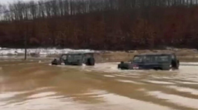 Në fshatin Sojevë dy vetura turke të KFOR-it shihen duke kaluar në thellësi të ujit afër kampit “Bondsteel”.