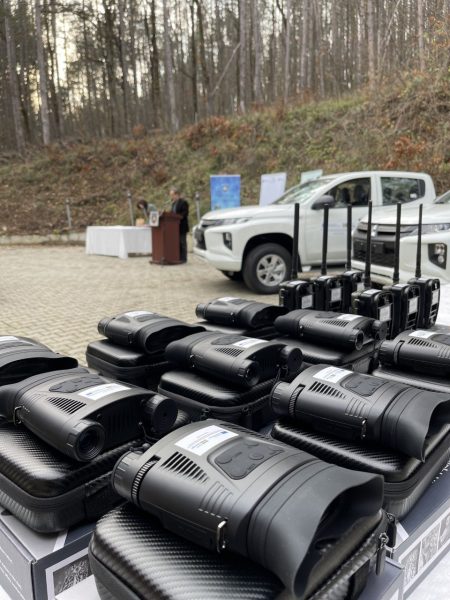 Gjashtë automjete pick-up me kamera dhe pajisje GPS të integruara për inspektime në pyje, pajisje GPS për mbledhjen e të dhënave në terren, kamera kurth dhe dylbi nate për zbulimin e aktiviteteve të paligjshme pyjore iu dorëzuan Agjencisë në një ceremoni të organizuar në vendgjuetinë me rëndësi të veçantë “Blinaja”.