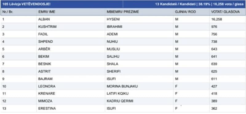 Rezultatet u certifikuan për këto komuna: Deçan, Gjakovë, Gllogoc, Gjilan, Dragash, Kaçanik, Klinë, Fushë Kosovë, Kamenicë, Mitrovicë e Jugut, Leposaviq, Lipjan, Novobërdë, Obiliq, Rahovec, Pejë, Prishtinë, Podujevë, Prizren, Skënderaj, Shtime, Shtërpcë, Suharekë, Ferizaj, Viti, Vushtrri, Zubin Potok, Zveçan, Malishevë, Junik, Mamushë, Hani i Elezit, Graçanicë, Ranillug, Partesh, Kllokot dhe Mitrovicë e Veriut.