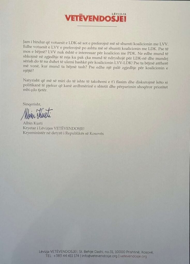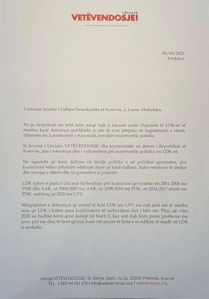 Lajmet Qendrore LAJMI I FUNDIT: Albin Kurti lut Lumir Abdixhikun për koalicion 05/05/2025 - 10:0205/05/2025 mediafokus Për të tretën herë Albin Kurti i ka dërguar ftesë Kryetarit të Lidhjes Demokratie të Kosovës, Lumir Abdixhiku.Kësaj here krejtësisht i shpaluar në kërkesë për koalicion mes Vetëvendosjes dhe Lidhjes Demokratiek të Kosovës.“Unë nuk kam pasur problem me juve”, i shkruar Kurti – AbdixhikutNDAJENI KËTË ME TË TJERËT: Klikoni që ta ndani me të tjerët në Facebook (Hapet në një dritare të re) Facebook Klikoni për ta ndarë me të tjerët në WhatsApp (Hapet në një dritare të re) WhatsApp