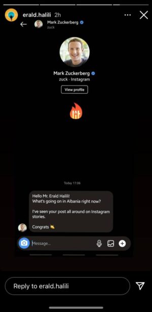 “Çfarë po ndodh në Shqipëri në këto momente? Unë kam parë postimin tënd kudo në Instagram Stories. Urime”, ka thënë Zuckerberg.