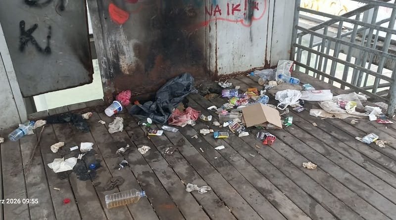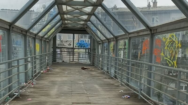 Struktura metalike dhe xhamat e mbi kalimit janë të mbuluara me grafite dhe papastërti, ndërsa dyshemeja prej druri duket e konsumuar dhe e lagësht, duke rritur rrezikun për rrëshqitje, sidomos në ditë me shi.