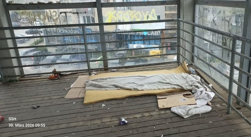 Në disa pjesë të mbi kalimit vërehen edhe gjurmë djegieje, ndërsa në një cep janë vendosur materiale improvizuese për fjetje, duke lënë të kuptohet se hapësira përdoret edhe për qëndrime të përkohshme.