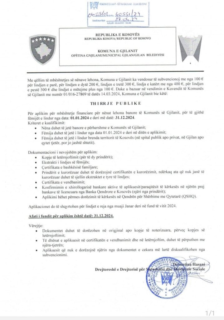 Më shumë dokumente kërkon komuna e Gjilanit për 100 euro shpërblim për lehonat se sa kërkohen për marrjen e shtetësisë së Kosovës