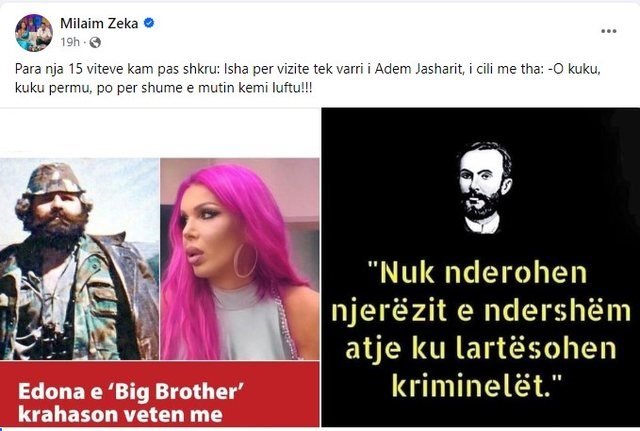 “Para nja 15 viteve kam pas shkruar: Isha për vizite tek varri i Adem Jasharit, i cili me tha: -O kuku, kuku për mu, po për shumë e mu*** kemi luftuar”, u shpreh ai.
