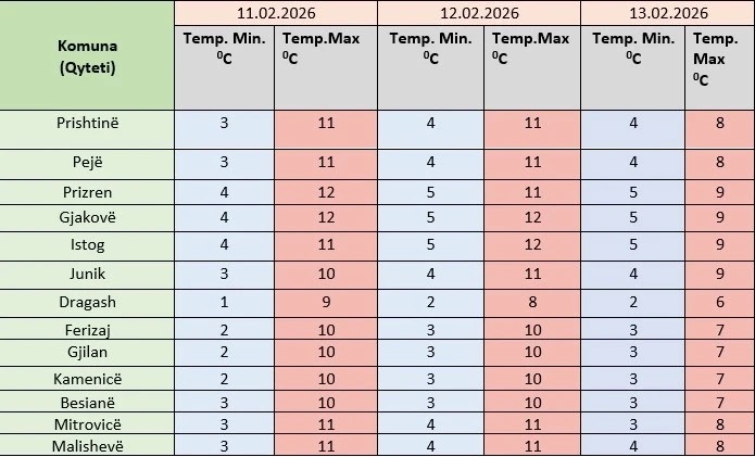 Instituti Hidrometeorologjik i Kosovës ka bërë të ditur se temperaturat minimale do të sillen mes 3-5 gradë celsius, e maksimalet mes 6-9 gradë.