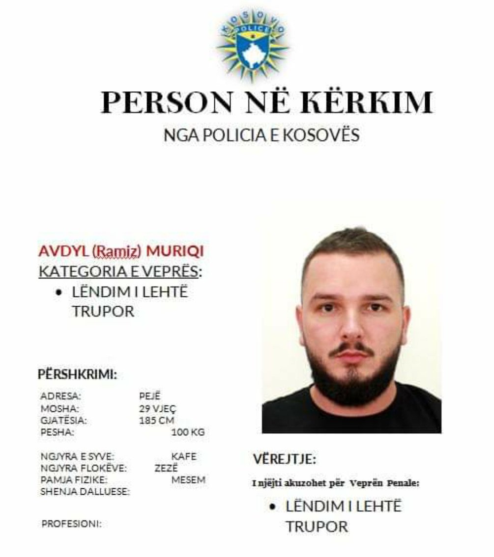 Policia e Kosovës – Drejtoria Rajonale e Policisë në Pejë, bazuar në ligj për publikimin e fotos me shënime tjera të personit të kërkuar më autorizimin e Prokurorisë themelore nё Pejё, me qëllim lokalizimin dhe rrjedhimisht arrestimin e tij, lëshon: Kërkesë për bashkëpunim me qytetarët.