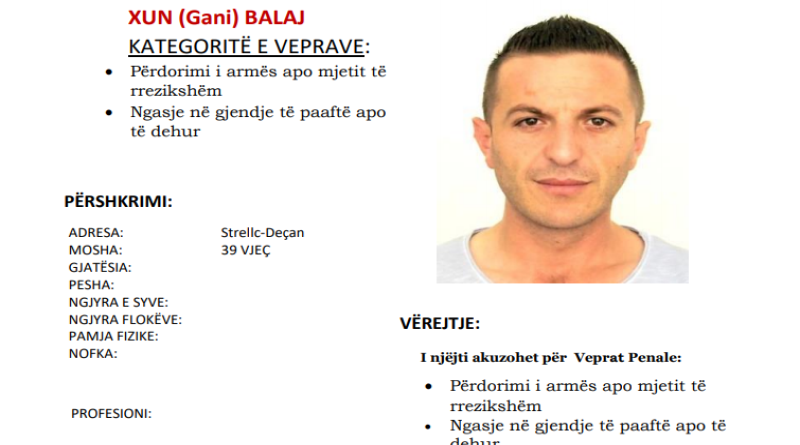 Policia e Kosovës – Drejtoria Rajonale e Policisë në Pejë, bazuar në ligj për publikimin e fotos me shënime tjera të personit të kërkuar më Urdhëresë të Gjykatës Themelore nё Pejë dhe dega në Deçan, me qëllim lokalizimin dhe rrjedhimisht arrestimin e tij, lëshon: Kërkesë për bashkëpunim me qytetarët.