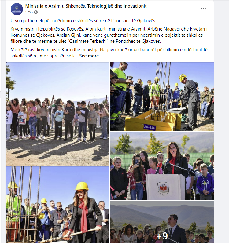 Ministria e Arsimit, Shkencës, Teknologjisë dhe Inovacionit ka publikuar në facebook një njoftim ku thuhet se është vënë gurthemeli për ndërtimin e shkollës së re në Ponoshec. Megjithatë ajo që bie në sy në këtë postim është një fotografi e publikuar nga faqja zyrtare e MASHTI-t ku shihet një burrë duke treguar gishtin e mesëm.