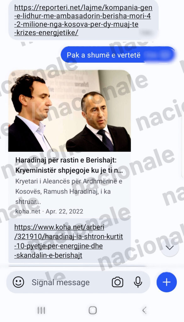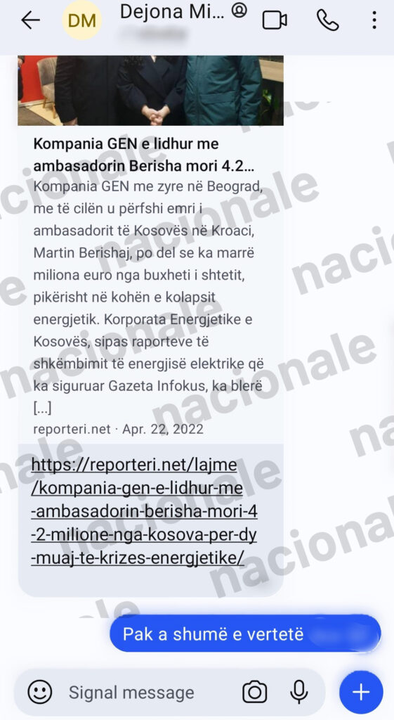 Platforma ‘Signal’ që njihet si më vështirë e përgjueshme, ka qenë forma më e shfrytëzuar për komunikim ndërmjet koordinatores së komiteteve në Vetëvendosje, Dejona Mihalit, dhe ish-kryeshefit të KEK-ut, Nagip Krasniqi.