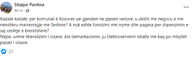 “Kadale kadale; për komunat e Kosovës që gjenden ne pjesën veriore, është dashur me negocu e me nënshkru marrëveshje me Serbinë? A nuk është furnizimi me rrymë dhe pagesa për shpenzimin e saj çështje e brendshme”?, ka shkruar ajo të martën në Facebook.