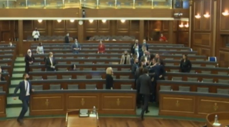 Në pamje shihet se shefi i grupit parlamentar të LDK-së, Arben Gashi, është përplasur fizikisht me deputetët e LVV-së, Hajrulla Çeku dhe Hekuran Murati.