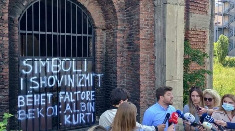 Dje në këtë objekt u mbajt një liturgji kishtare. Në mes të ditës, në mes të Prishtinës, para hundëve të krejt institucioneve, simbolin e shovinizmit duan ta bëjnë faltore. Jemi këtu per një deklaratë: simboli i shovinizmit nuk mund të jetë shtëpi e zotit.
