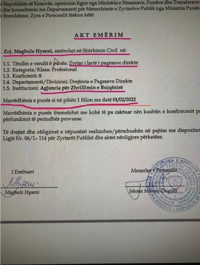 Gazetari Lirim Mehmetaj ka publikuar edhe një vendim me të cilin motra e ministrit Xhelal Sveçla, Magbule Hyseni, është emëruar Zyrtare e Lartë e Pagesave Direkte në Drejtorinë e Pagesave Direkte në Ministrinë e Bujqësisë që drejtohet nga ministri Faton Peci.