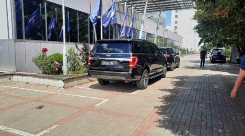 Nw fotografi, shihen automjetet e diplomatëve ndërkombëtarë të parkuara para ndërtesës së Qeverisë.
