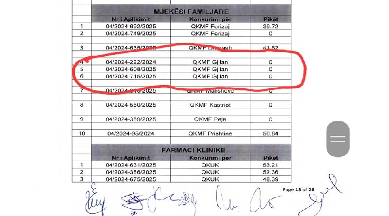 Ministria e Shëndetësisë, para pak ditësh, publikoi listën e kandidatëve të pranuar për shkollim specialistik, por ata nga QKMF e Gjilanit figurojnë të refuzuar dhe me zero pikë të vlerësuar.