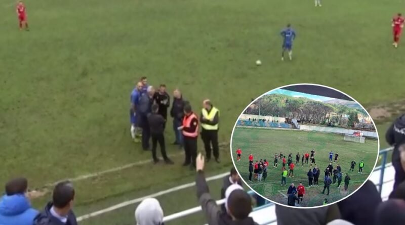 Situatë e cila ka sjellë vërshimin e sendeve të forta nga tribuna, një prej të cilave ka goditur gjyqtarin anësor, i cili më pas është rrethuar edhe nga lojtarët vendas që protestonin furishëm.