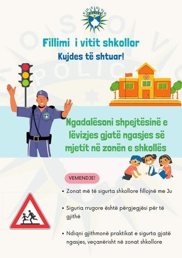 “Në prag të fillimit të vitit të ri shkollor, Policia e Kosovës apelon për një përgjegjësi të shtuar nga të gjithë pjesëmarrësit në trafik. Në zonat pranë shkollave dhe ku janë vendosur tabelat njoftuese si “Kujdes, shkolla” dhe “Këmbësorë,” është jetike që të gjithë të tregojnë kujdes maksimal. Fëmijët janë më të brishtë dhe të paparashikueshëm në lëvizje, kështu që shpejtësia e ulët, vëmendja e lartë dhe respektimi i sinjalistikës rrugore mund të shpëtojë jetë.”