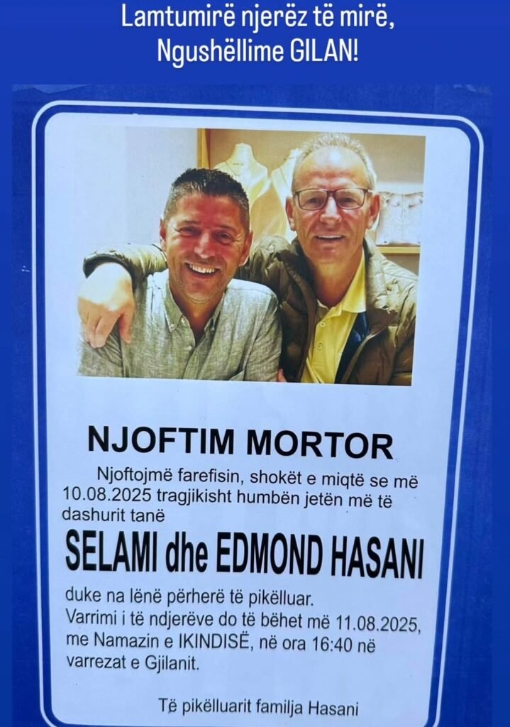 Selami dhe Edmond Hasani, babë e bir, viktima të rastit të djeshëm në Gjilan, ku i dyshuar është Mefail Shkodra dhe dy djmetë e tij, do të varrosen sot në Gjilan.