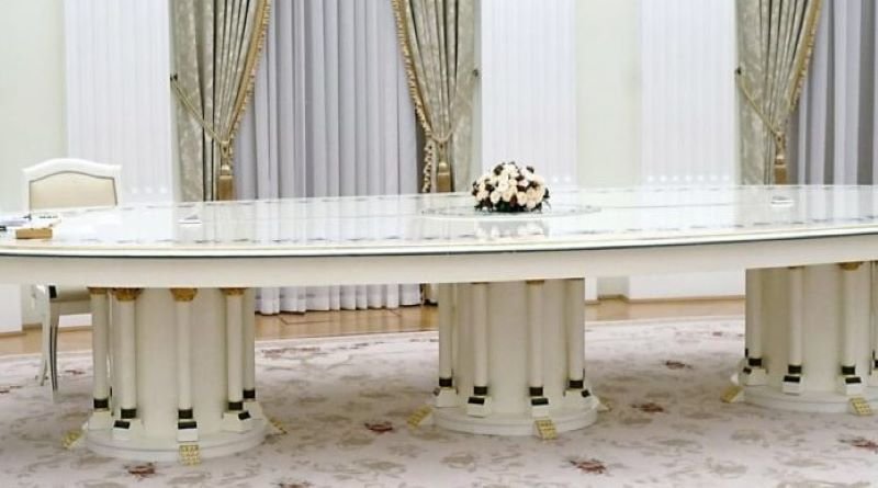 Imazhi i tryezës gjigante ovale ku Vladimir Putin dhe Emmanuel Macron u ulën në një distancë të madhe gjatë një takimi të tensionuar për Ukrainën ka bërë xhiron e botës.