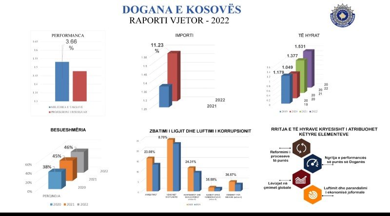Dogana e Kosovës prezantoi sot raportin e vitit 2022 ku u theksua se viti 2022 përbën rekord në të hyra të inkasuara nga Dogana e Kosovës.