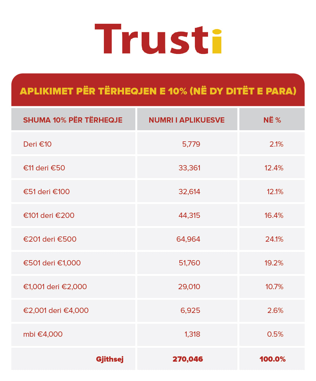 Trusti publikon statistikat e aplikimeve për tërheqjen e 10 përqindëshit në dy ditët e para