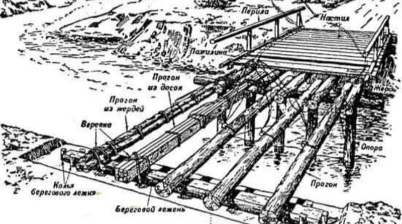 Së pari nguleshin lëndët vertikalisht në tokë, këmbët e urës (ato rraheshin me tamth). Mbi to vendoseshin lënd të mëdha druri pastaj lëndë të tjera në dy drejtime.