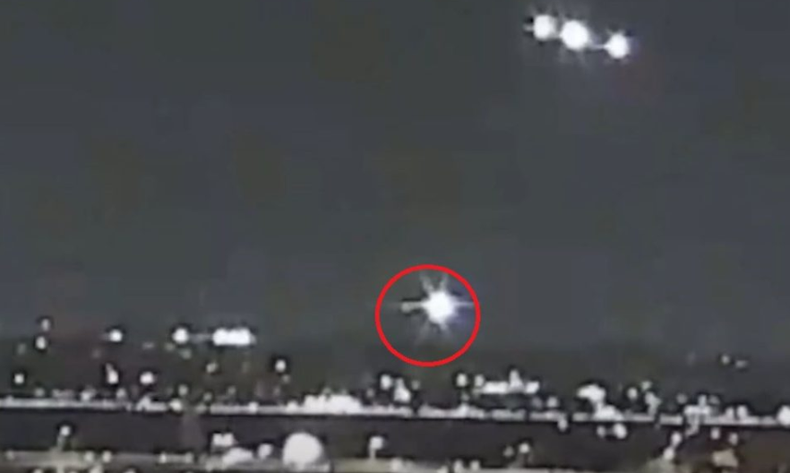 Nga largësia shihet një dritë më e fortë, mësa duket e aeroplanit të udhëtarëve, si dhe një dritë më e dobët teksa i afrohet asaj, me gjasë e helikopterit ushtarak.