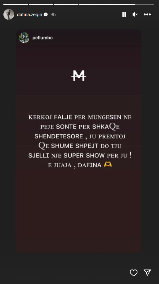 “Kërkoj falje për mungesën në Pejë sonte për shkaqe shëndetësore, ju premtoj që shumë shpejt do t’ju sjelli një super show për ju. Ju dua, Dafina”, shkruhej në postimin e menaxherit të saj, që më pas u ripostua edhe nga llogaria e Dafinës.